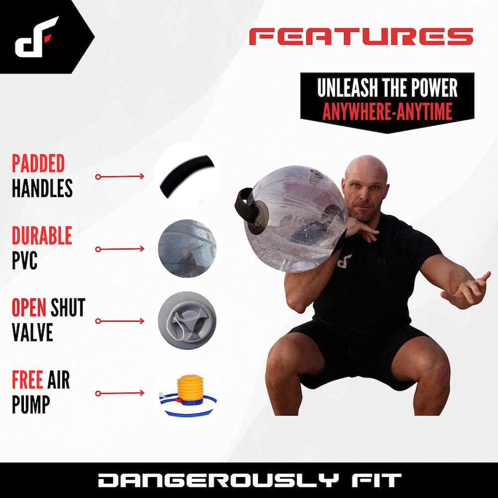| Benefits | ✅ By simply changing the hand position and exercise selection the highly versatile Aqua Ball can be used as a Medicine Ball or Kettlebell. ✅ Pick up the Aqua Ball and instantly discover the unforgiving properties of training with water. ✅ Feel the entire weight flow freely through the ball from one side to the other amplifying the slightest of movements. ✅ Improve the adaptability to unpredictable, unexpected, quick changes in resistance. Unlike lifting a predictable ‘dead weight’, the Aqua Ball (a live weight) reacts to your every movement which increases maximal muscle recruitment, improves motor control and develops full body stabilisation like no other training tool on the planet. ✅ The ultimate travel training tool… train anywhere, anytime. Train at home without damaging the floors (or your feet) or simply fold up and take it with you wherever you go. Just quickly fill with water and air and you’re ready for a killer workout! ✅ No two reps are ever the same… The Aqua Ball forces your body to actively engage in order to control and stabilise the shifting load. ✅ Dynamic responsive training builds full body stability from the ground up and is scientifically proven to achieve greater core activation. ✅ Save money buying one ball that can be filled to your desired weight by simply adding more water to increase the resistance as you become stronger. ✅ A multi-planar training tool delivering a more balanced training program that will improve your ability to cope with the demands of your everyday life. ✅ The innovative design allows you to push, pull and swing the Aqua Ball in an almost endless number of ways. Plus, the water filled PVC balls are soft to hold making exercises such as cleans and snatches comfortable to perform. |