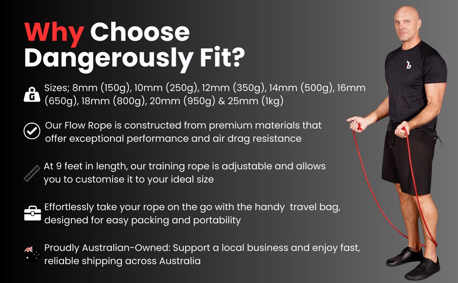 | Why Choose Dangerously Fit Flow Ropes? | ✅ Heavy-Duty Nautical Double-Braid Rope: Our Flow Rope is constructed from premium materials that offer exceptional performance and air drag resistance. It’s so robust that it can literally tow a truck! |